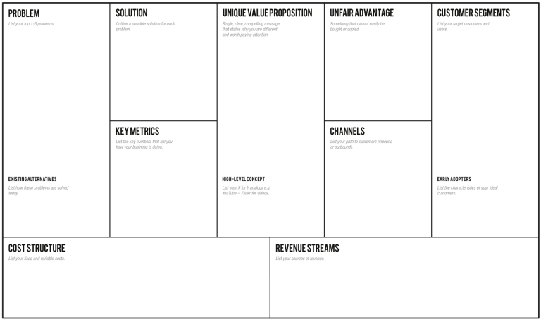 The lean canvas business plan template is a great one-page business model template for outlining the most important aspects of every starting business. It is divided into 9 core segments and we'll use all of them to describe our startup idea.