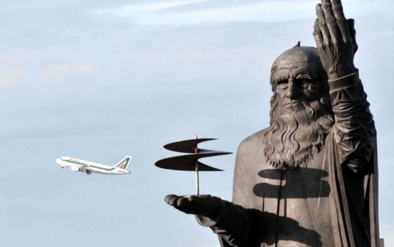 In front of the Italian airport, a magnificent statue of Leonardo da Vinci is situated.