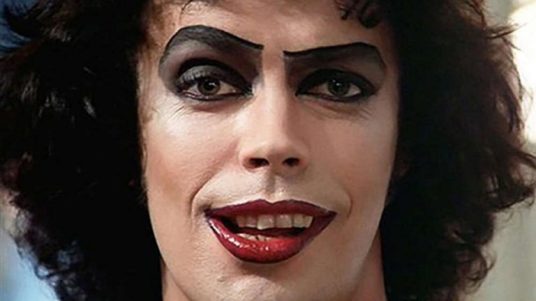 In the 1975 edition of the Rocky Horror Picture Show, the display of fiery red lipstick and androgynous looks was showcased by Tim Curry.